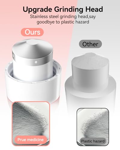 - 【Upgraded Grinding Head】: The pill crusher find powder uses a grinding head and bin with 304 stainless steel to completely separate the medication from the plastic, ensuring that no plastic remains in the powder, 【3-in-1 Multi-Function】: This pill crusher has multiple uses to cut, store and grind pills to meet your multiple use needs, 【Easy to Use】: Take out the medicine from the storage box, split it using the pill cutter then place the fragments into a pill grinder and rotate the grinder 3-5 times to obtain the desired powder, 【Cutting Pills of Different Size】: Our pill cutter uses a V-groove design, which can hold different sizes of tablets(3mm to 20 mm), and for some hard medicines can be split before grinding, which can better grind the medicine into powder, 【Portable Size】: This pill crusher measures 2.25 * 2.25 * 3.2 inchs and fits in your pocket and backpack, easy to carry around and ready for medicine grinding