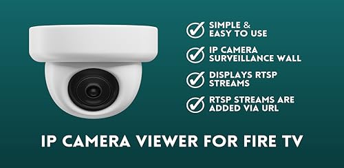 - IP Camera Viewer for Fire TV, -Simple & Easy to Use, -IP Camera surveillance wall., -Displays RTSP streams., -RTSP streams are added via URL