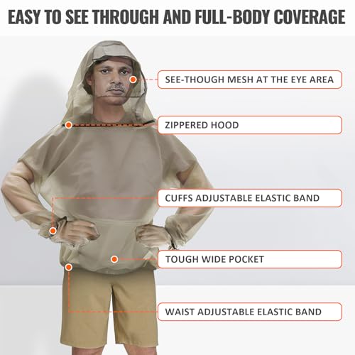 - 2-piece Insect Repellent Suit - The mosquito repellent suit comes as a jacket and gloves, covers entire upper body including face and hands from bugs, yet let's air pass through so you stay cool. This mosquito netting works for mosquitos noseeums ticks wasps bees and is pretty easy to manage, Lightweight, Airy and Durable Material - The mesh material is airy and doesn't weigh you down. Plenty of air gets thru and you never get sweaty or hot. The upgraded see-through mesh at the eye area offers clear visibility, you don't even notice. The weave is super high density keeps mosquito suit from snagging on, Generous Sizing Options - Available in three sizes: S/M fits up to Height 5’3”-5’9” , 130-180lbs; L/XL fits up to Height 5’3”-6’3” , 160-200lbs; XXL fits up to Height 5’3”-6’3” , 200-240lbs. Nice loose fit makes material bunch up enough so skin contact is minimal. There is plenty of room in the head area to accommodate a hat, Quick Face Access and Adjustable Drawcord - There is a zipper for pulling back the face covering if you need to drink or eat. Cuffs and wrists have adjustable buckles that can be adjusted in size and length, you can tighten via the elastic strings/bands. That helps to keeps the bugs out, Tough Wide Pocket - The Mosquito jacket features a spacious mesh pocket, ideal for storing a hat, tools, or other essentials. The suit also comes with a compact carry pouch, making it easy to pack for hiking, camping, or kayaking trips