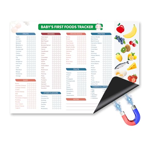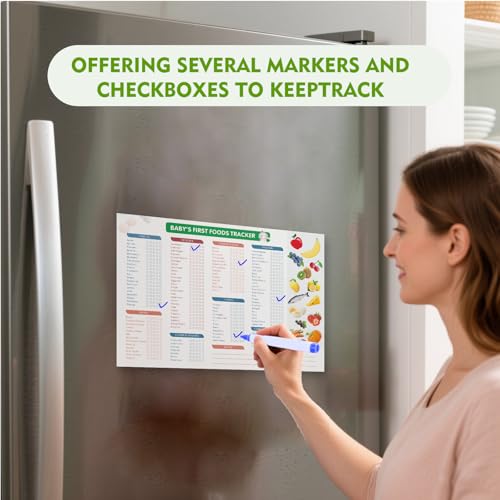 - Track Baby’s First Foods with Confidence: Introduce new foods and monitor your baby's reactions with this baby food chart fridge magnet. Help prevent picky eating by exposing your baby to a wide variety of tastes and logging their food journey, Comprehensive Checklist with 127 Foods: Baby food checklist includes fruits, veggies, proteins, grains, dairy, and more—127 foods in total. Each item features five check-boxes to track multiple tastings, helping your baby gradually accept new foods, Durable & Reusable Magnetic Chart: Baby first food tracker made from waterproof and tear-resistant material, this 10"x14" chart is built to last. Its reusable dry erase surface wipes clean easily, and strong magnets keep it securely in place on your fridge, Stay Organized Every Day: This food tracker with a clean and intuitive layout, this baby food log keeps feeding routines organized. Track what your baby eats daily and better understand their preferences and nutritional needs, Perfect Gift for New Parents: A thoughtful and practical gift for baby showers or new moms and dads. This baby food tracker supports healthy habits and makes early parenting more organized and stress-free