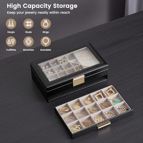 Lolalet Earring Storage Box Case, Large Earring Jewelry Holder Organizer for Women, Glass Top Display, with Drawer and Grid -2 Tiers, Black