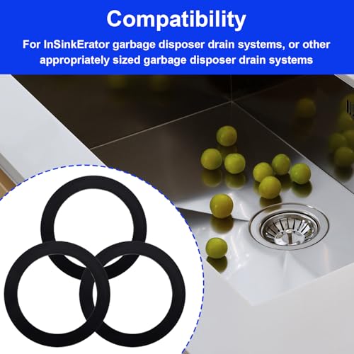 - Size Information: The garbage disposal sink sealing rings measure about 10.9cm/4.3in in outer diameter, 8.3cm/3.27in in inner diameter, and 1.3cm/0.5in in width, suitable for most standard kitchen sink drain assemblies., Reliable Material: The kitchen sink drain gasket seal rings are made of rubber material, good quality, reliable, sturdy and durable. Not easy to break or wear, and have a long service life., Package List: You will receive 3 pieces of the rubber sink sealing rings, can meet your daily use and replacement needs. Easy to install, just place between the drain and sink., Leakproof: The rubber sink sealing rings can fit firmly, have good sealing, and the drain pipe plug-in gasket has a significant leak-proof effect, can effectively improve efficiency and performance and bring you a better use experience., Compatibility: Suitable for InSinkErator garbage disposal drainage system, or other garbage disposal drainage systems of suitable size. (Please note that our product is not sponsored or endorsed by, or affiliated with the brands it fits, including InSinkErator.)