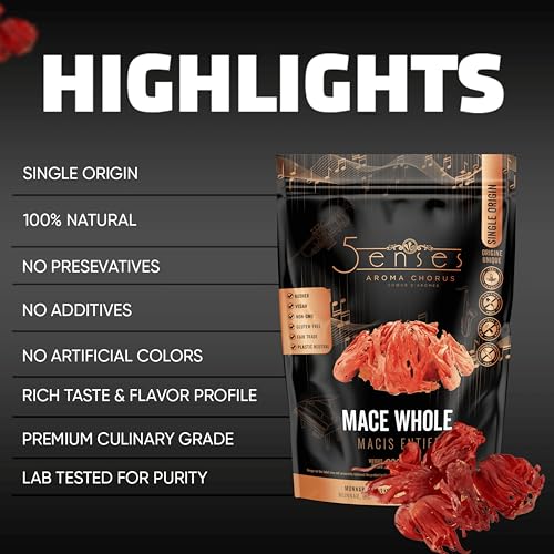 - Single Origin Spice: This premium whole mace is grown in the pristine, high-altitude spice gardens of Munnar, India, Kerala's Western Ghats being a unique place known for its fertile soil and centuries-old farming traditions. We obey all international fair-trade regulations, for a sustainable and earth friendly experience!, Naturally Sun-Dried for Pure Flavor: Our cooking mace is handpicked and carefully sun-dried in natural settings, keeping its warm, nutty scent with mild citrus, clove, and pine notes. Processing is minimal, bringing the entire flavor to your doorstep!, Endless Possibilities For Sweet And Savory Dishes: Our mace seasoning is ideal for both classic, traditional or contemporary dishes, adding a distinct flavor to broths, stews, baked products, and spice mixes. It complements cinnamon, cloves, and other warm spices, for in mouth-watering desserts!, Pure and Conscious Product: Ingredients are 100% natural, with zero preservatives, MSG, dairy, nuts, gluten, and artificial colors. This mace whole is packed in resealable, practical pouches to preserve freshness, being ideal for your pantry or spice rack., A Synergistic Approach to Cooking: Indulge your senses by combining your cooking experience with the sounds of 5Senses Aroma Chorus! Our original music is available on all major platforms to enrich and enchant your cooking time.