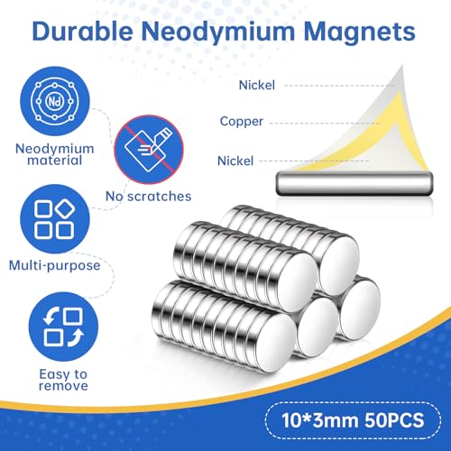 - 【Multi-Use Round Magnets】These magnets serve multiple purposes and could be used as refrigerator, whiteboard, office, craft,3d printed projects, educational, and other hobby magnets. They're also handy for sticking items like reminder notes, to-do lists, and photos and are very useful in the home, office, or school., 【Durable Material】Our magnets are made of durable neodymium metal, resistant to corrosion and oxidation, ensuring they meet your needs while offering a long service life., 【No Marks】Our durable mini magnets feature smooth surfaces that won't scratch your refrigerator, office board, or any other surface. Easily remove them without marks or stains., 【Useful Design】Despite its small size(Diameter: 10 mm, thickness: 3 mm), each magnet can hold up to 20 A4 sheets of paper, so you don't have to worry about your items slipping off easily.Warm Tips: Keep these magnets out of the reach of small children. The fridge magnets are not suitable for children under 14 years old., 【Package Includes】Our package includes 50 small silver magnets, and they come with a plastic case for easy storage. Tip: These magnets are very small, so please keep your children and pets away from this product to avoid accidental ingestion.We are a professional small magnets seller, and you can find any magnets you want in our store.