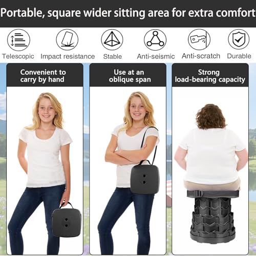 - [Durable,Sturdy,Stable,2020 Upgrade Patented Design]:Fish scale structure reinforced clasp for more sturdy and stable ,The body of the stool is made from 120 segments,and each layer has multiple buckles for safety,sturdy,durability,stability,comfortable,resistance and safer than old versions,load capacity is 400lbs., [Foldable,Adjustable height ]:The folding Camping stool to open and close easily in just seconds, lock in place with slight rotation, easy installation. The height can be adjusted freely between approximately 2.56 inch and 17.7 inch,It applicable for adults and children,it is perfect for sending as a gift for family,friends,relatives., [Portable,Lightweight]: Diameter and height in the closed state are 10" and 2.56" of this retractable stool, weight is 2.54 lbs. You can carry it in your hand or hanging on your shoulder with the adjustable 21.7” straps without any burden.The retractable stool is portable, lightweight, small and convenient to place into luggage ., [Easy to use,Multipurpose]:super easy to use. You can open it by holding both ends and pulling to open with slight turning them,perfect for indoors and outdoors. Indoor occasions such as the living room, bedroom, bathroom, kitchen,office.Outdoor activities: drawing room,garden,hiking,BBQ,camping,queue,fishing, kitchen, etc, [Self-open Prevention]:When this fold up stool is closed, snap joints designed on the caps come into play to prevent stool opening by itself. This make it more convenient and easier to bring it along for outdoor activities,the non-slip base ensure that this collapsable stool will give the stability to provide safe and comfortable sitting.
