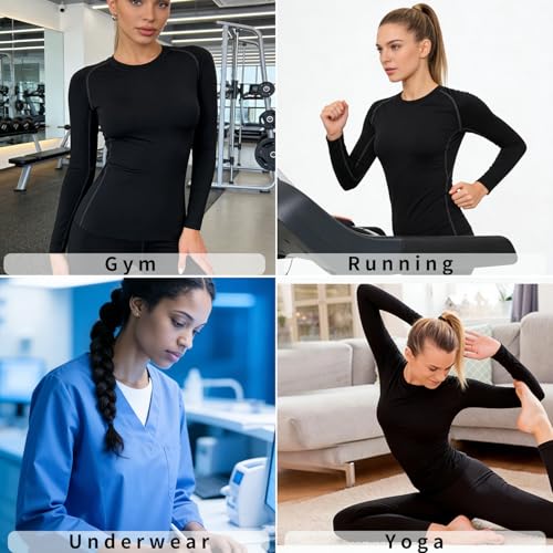 - Quick Dry Workout Top with Moisture Wicking-Engineered as a quick dry workout top,90% Polyester / 10% spandex the fabric pulls sweat away instantly and dries in minutes. The moisture wicking yoga shirt technology keeps you cool during hot flows or cardio bursts—no damp cling or odor buildup., Lightweight Compression Fit for Muscle Support Designed to feel like a second skin, shirt provides true, supportive compression that gently hugs your body. It helps improve muscle awareness during workouts, may reduce fatigue, and creates a sleek, streamlined silhouette for running, lifting, or yoga without restricting your range of motion., Women’s Compression Long Sleeve Shirt for Maximum Support-Compression long sleeve shirt for women delivers targeted muscle support during high-intensity workouts. Designed as a true performance athletic top,Reduces fatigue—ideal for running, weightlifting, or endurance training., The lightweight and breathable long sleeves offer sun protection and light warmth while preventing overheating. Made with strategic airflow in mind, they work with the moisture-wicking fabric to regulate your temperature, making it perfect for indoor workouts or outdoor training in changing weather., Built for Multi-Sport Versatility: Running, Gym & Training-Wear this long sleeve compression top women trust for everything: outdoor runs, Cross Fit sessions, yoga studios, or recovery days. The 4-way stretch moves with you, while flatlock seams prevent chafing during dynamic motion.