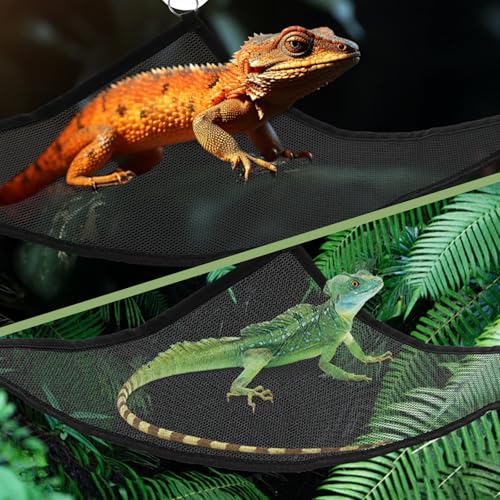 - High-Quality Material: Reptile hammock is made of breathable, smooth polyester mesh, and each piece comes with 3 strong suction cups that help secure the reptile hammock to the tank. Suitable for glass, plastic, acrylic containers, etc., Enjoy Climbing Time: Two bearded dragon loungers create a multi-level jungle gym. The higher place encourage them do more exercise and keep them active. This Reptile Hammock set is a wonderful addition to reptile tank., Easy to Clean Versatile: The triangular bearded dragon hammock is designed for simple disassembly and assembly, making cleaning and replacement a breeze. These breathable reptile hammocks are perfect for iguanas, axolotls, anoles, geckos, snakes, and chameleons., Multipurpose: Reptile hammock is suitable for most reptile pets, chameleons, lizards, bearded dragons, geckos, hamsters, parrots, turtles, tree frogs, snakes, etc. It's an ideal place for reptiles to sleep and play., Value Set: Includes two black-bearded dragon reptile hammocks, each equipped with three suction cups, providing you with ample options for use and replacement. Hammock Size: Triangular design with side lengths of 18.9 × 12.99 × 12.99 inches/48 × 33 × 33 cm.