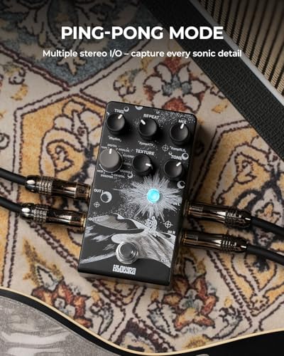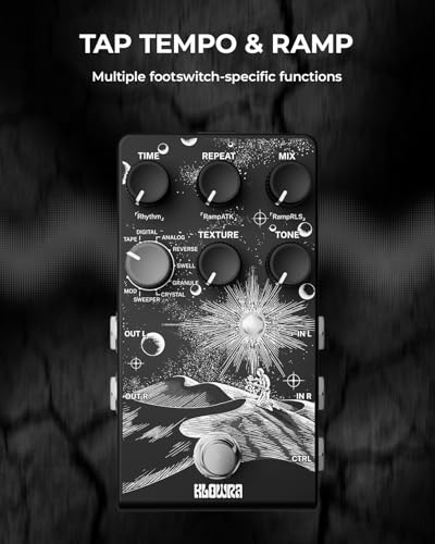 - Original Hand-Drawn Design – Every Klowra pedal features exclusive artwork inspired by meditation and cosmic imagination. A unique piece that looks as inspiring as it sounds, perfect for personal use or as a thoughtful gift., 9 Studio-Grade Reverb Types - Tape, Digital, Analog, Reverse, Swell, Granule, Crystal, Sweeper, Mod., Tap Tempo Function - Real-time TIME control with support for quarter, dotted eighth, and eighth-note triplet divisions., Delay Time - 20ms -1200ms adjustable for accurate timing control, Ramp Function - Bring motion to your tone. Smoothly glide between parameters to create evolving textures and dynamic sonic movement that breathe life into every note., Analog Dry-Through - Keeps the dry signal in a fully analog path, mixing it with digital effects for uncompromised tone integrity., Stereo Output Options - Includes Ping-Pong mode, Dry/Wet split, and True Stereo output for flexible connectivity., Bypass Modes - Switch between True Bypass (Trail on) and Buffered Bypass (Trail off), both preserving a pure analog dry path for uncompromised tone., Aluminum Alloy Housing - Strong, lightweight, and built for long-term durability., WildSeed Engine - 24-bit AD/DA and 32-bit DSP ensure superior, professional-level audio performance.