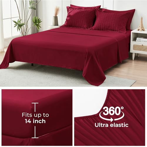 HYMOKEGE Burgundy Queen Comforter Set, Seersucker Bed in a Bag Queen 7 Pieces, All Season Luxury Bedding Set with Comforters, Sheets, Pillowcases & Shams