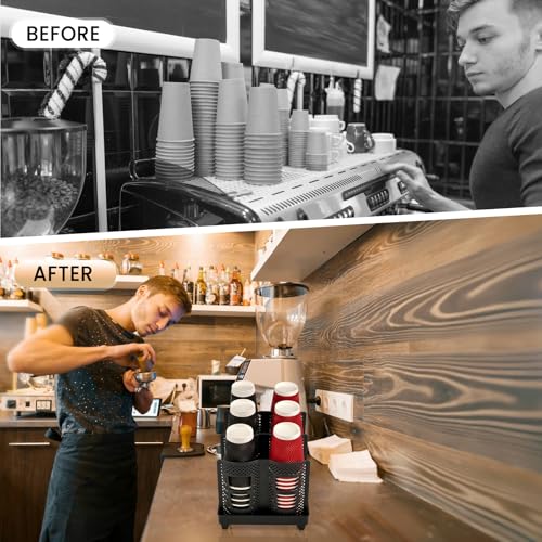 - 🥤𝗟𝗮𝗿𝗴𝗲 𝗖𝗮𝗽𝗮𝗰𝗶𝘁𝘆: Measuring 13 x 8.6 x 7.9inch, the cup organizer features 6 slots that can stack up to 20 cups per section, holding up to 120 at one time for disposable coffee cups and lids at a time.Perfect to give a neat cups and lids organizer solution in office, coffee breakroom, Bar, Buffet,Restaurant ,bathroom,hotel lobbies, home countertop, dorm rooms etc., 🥤𝗣𝗿𝗮𝗰𝘁𝗶𝗰𝗮𝗹 𝗖𝘂𝗽 𝗢𝗿𝗴𝗮𝗻𝗶𝘇𝗲𝗿: This paper cup stand for countertop comes with the thoughtful bracket that allows the cup dispenser be placed flat or tilted. It offers flexibility to fit various countertop setups and storage needs, making it convenient for kids, staff, and customers to access disposable coffee and beverage cups and lids., 🥤𝗦𝘂𝗽𝗲𝗿𝗶𝗼𝗿 𝗔𝗕𝗦 𝗠𝗲𝘁𝗲𝗿𝗶𝗮𝗹: Our disposable coffee cup holder is made of high quality thicker plastic, does not contain harmful substances, sturdy and safe with strong durability. This cup dispenser is designed with hollowed out carvings for easy ventilation, avoiding moisture inside the cup and keeping the cup dry and clean., 🥤𝗦𝗮𝘃𝗶𝗻𝗴 𝗦𝗽𝗮𝗰𝗲: This coffee cup holder organizes cups and lids, saves space and keeps the desktop clean and tidy. The coffee station organizer can also be used on cabinets, bathroom,breakroom, tea party and more. Organize your disposable cups with this cup organizer to free up more storage space for you., 🥤𝗘𝗮𝘀𝘆 𝗜𝗻𝘀𝘁𝗮𝗹𝗹𝗮𝘁𝗶𝗼𝗻: Simplify your setup process with detailed instructions and perfectly fitting parts included in this large paper cup holder package. Install the washable disposable coffee cup dispenser effortlessly in just one minute. Please Please keep in mind that we provide quality products, go ahead to consult us anytime if you are not satisfied,we will solve your problem immediately.