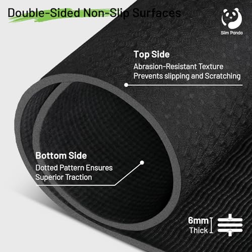 - [Extra Large Space] 72" x 48" Unrestricted Movement:Measuring 72" x 48" (183cm x 122cm), this extra large yoga mat provides twice the space of standard mats. Enjoy the freedom to perform any pose, from wide-legged stretches to intense cardio, without ever feeling restricted by the edge., [Dual-Side Non-Slip] Maximum Grip on Any Floor:Engineered with a two-toned textured surface, our wide exercise mat offers superior traction. The laser-engraved top prevents hands from slipping, while the bottom wavy pattern grips firmly to wood or tile floors, ensuring stability during vigorous practice., [6mm Pro-Cushioning] Joint Protection & Resilience:The 6mm (1/4 inch) high-density thickness provides the perfect balance of comfort and support. This thick workout mat relieves pressure on knees and joints while maintaining excellent resilience, protecting you during planks, lunges, and meditations., [Premium TPE Material] Eco-Friendly & Odorless:Crafted from high-quality TPE, Slim Panda fitness mats are non-toxic, latex-free, and recyclable. Unlike PVC mats that smell, our TPE material is skin-friendly and odorless, ensuring a pure environment for your home gym workouts., [Enhanced Bundle] 1 Multi-Use Yoga Strap & 2 Velcro Straps:Every large workout mat comes with a versatile yoga strap for deep stretching/carrying and 2 heavy-duty Velcro straps for secure storage. The dual-strap design ensures the mat stays perfectly rolled without expanding, even with its extra width.