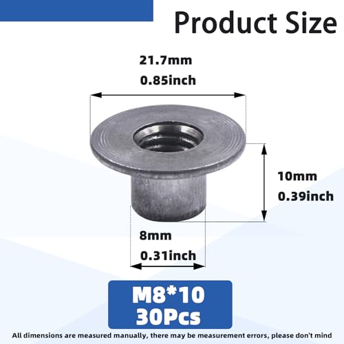 - ♛【Package Includes】: You will receive 30pcs round base weld tee nut and 1pcs storage box. Threads Specification: m8. Round Base Diameter: 21.7mm/0.85in. Height: 10mm/0.39in. A sufficient quantity is needed to ensure that you have enough spare parts for replacement or in case of any loss., ♛【High Quality Material】: Round base weld tee nut is made of high-quality carbon steel, providing sufficient hardness, strong load-bearing capacity and excellent resistance to deformation. The surface has undergone precise treatment, which not only prevents corrosion but also reduces frictional resistance. The thread notches are deep, providing a tighter fit and ensuring reliable connection., ♛【Easy to Use】: The round base ensures that the nut is aligned with the surface for easy installation and positioning. Simply drill holes of appropriate size in the wood and tighten the screws directly to easily install. When adjustments and replacements are needed, they can also be easily removed without damaging the wood. No additional processing is required after installation, and we will immediately provide you with a secure connection., ♛【Prevent Loosening】: Deep threads enhance the engagement with screws and prevent loosening and detachment. Precise thread processing can perfectly match with screws, and the round chassis has anti slip threads, making it difficult to rotate and fall off after installation. Internal threads and round base threads cooperate synchronously to disperse pressure and avoid local deformation., ♛【Wide Application】: Flange insert female thread plate nuts is suitable for assembling wooden furniture such as tables, chairs, wardrobes, drawers, display cabinets, etc. It can also be used for the installation of load-bearing structures such as ceilings, display cabinets, shelves, etc.
