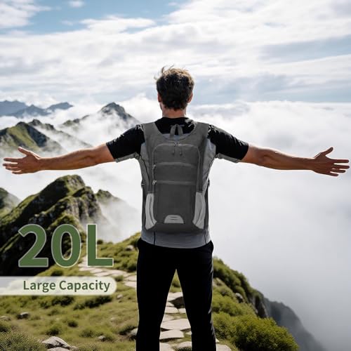 - -Lightweight Travel Backpacks- At just 0.66lb (290g) and 18.5"x11", this hiking backpack is good for travelers and outdoor lovers. It folds down to a compact 7.28"x9" bundle that easily tucks in your bags or hangs when not needed. Perfect for hiking, walking, shopping, cycling, or daily commutes, -Sturdy Material- The foldable day pack made of water repellent and tear-resist surface oxford fabric; keeping your belongings safe and dry. Thickened & Breathable Mesh shoulder straps with soft padding, providing comfort and shock absorption, and ensure a lightweight and effortless carrying experience, -Large Storage Space- This folding backpack has a large 20L capacity when expanded, including a main zipper compartment, 2 front zipper pockets, and 2 side mesh pockets for water bottles or other quick-access items. Whether you are cycling, camping or shopping, it can easily store all your essentials, -Reflective Strips Design- Stay visible in low-light conditions with collapsible backpack! High-intensity reflective strips on the front enhance your safety for night runs, cycling, or early-morning commutes, -Compact & Space-Saving Design- Folds down into small pocket in seconds! Great for travel, commuting, or emergency storage—unfolds into a full-size backpack when needed, No more bulky bags taking up space & Reduce plastic bag waste; The small pocket also can be a partition storage