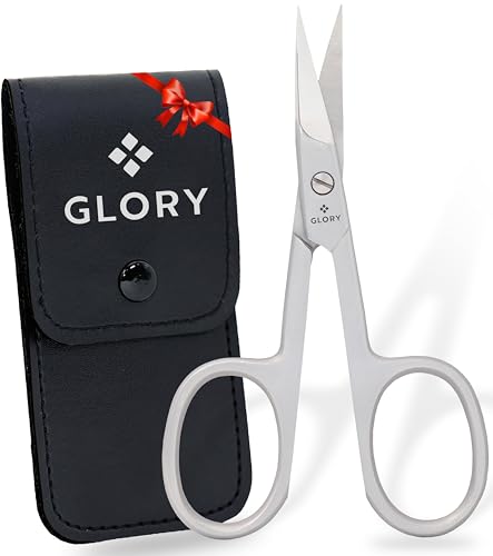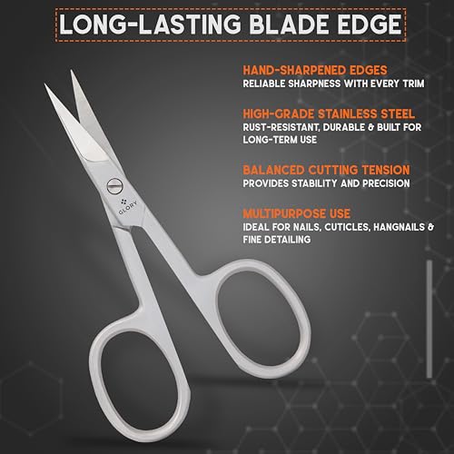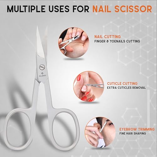 - Sharp Curved Blade Design: GLORY nail scissors feature a precision-crafted curved blade that follows the natural shape of your nails. The extra-sharp edges provide a clean, smooth cut every time, preventing splitting or jagged edges on both fingernails and toenails., Premium Grade Stainless Steel: Crafted from 100% premium stainless steel, this tool is built for durability and hygiene. It is rust-resistant and can be easily sanitized with alcohol, ensuring a safe and clean skincare routine at home., Precision Control & Comfort: Engineered with large, ergonomic finger loops to provide maximum control and stability. The smooth pivot mechanism allows for effortless cutting, making it easy to use for both right and left-handed individuals., All-in-One Grooming Tool: More than just nail cutters! These small scissors are perfect for precise cuticle trimming, shaping eyebrows, trimming eyelashes, and grooming facial hair like mustaches and beards. A versatile essential for your beauty kit., Compact & Travel Ready: Sleek and lightweight, these 3.5-inch scissors fit perfectly into any manicure set or travel toiletry bag. Whether at home or on the go, GLORY gives you salon-quality precision in the palm of your hand.