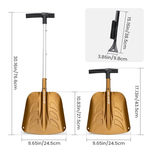 - 【Lightweight Aluminum Alloy Material】-The snow shovel is made of high-quality aluminum alloy, which is resistant to high temperature, wear and chemical corrosion. It has a long service life, and does not need to be replaced for many years., 【Collapsible Design】-Shovel Head: 11.02*10.24in, Folded:12.6*10.24in,Overall length : 25.98in. The lightweight and adjustable design making it convenient to carry on winter hikes or store in the trunk of a car. It is available at any time without taking up too much space, allowing you to respond to any emergency at any time., 【Multi-Function & Additional Accessories】-Adopting a multi-functional design, equipped with a 180-degree shovel and a 90-degree hoe. The Glass Ice Scraper Brush 2-in-1 Tool features ultra-soft polishing bristles that protect paint from scratches while maintaining rugged durability to swiftly clear ice, frost, and stubborn snow buildup from car windows., 【Versatile Use 】-Suitable for all seasons, easily handle snow, sand, mud or dirt. Perfect for four-wheel driving, camping, hiking and other activities, this snow shovel is a must-have tool for any adventure and can cope with various outdoor challenges and environments., 【Easy to use & Satisfaction Guarantee】- Press the pop-up button to adjust the length and it can be easily assembled in a few minutes.If you are not satisfied with your purchase, please contact us and we will provide the best service for you.