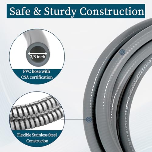 - DO FOR WHAT: This natural gas hose kit is perfect for a wide range of natural gas appliances, including Weber and Charbroil grills. It connects your natural gas grill, ensuring a reliable and efficient BBQ experience, QUALITY IS TOP: The natural gas hose is triple layered, riveted to the couplings and 100% gas tight tested to prevent natural gas leakage. High-quality PVC material can effectively prevent cracking, animal tearing and so on., SAFETY: Maximize your safety with CSA-certified products. To ensure safety, it is essential to regularly inspect all gas connections for potential leaks by using a soapy water solution. Please use professionaltools to tighten., DO OUR BEST: We are a professional and trustworthy gas hose manufacturer, dedicated to the design and production of gas hose for many years. Please give us an efficient evaluation, and we will improve with the comments., CONFIDENCE: Your satisfaction is our top priority and we do our best to provide you with a comfortable experience. If you are not satisfied with our product, please contact us via email on Amazon or use the “Ask a Question” button. We are committed to resolving any issues in a timely manner.