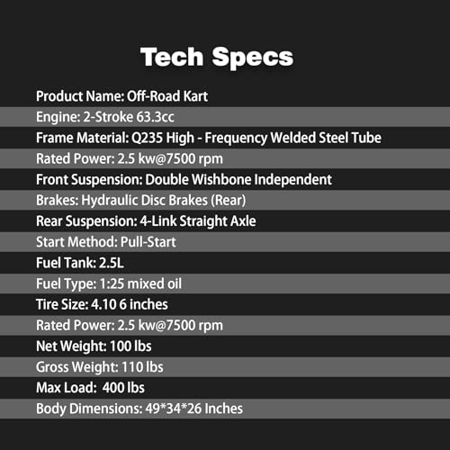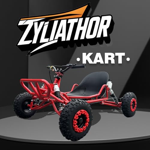 - 【FAMILY OUTDOOR FUN | 63cc 2-STROKE (EPA)】 Zyliathor 63cc 2-stroke gas off-road go kart for family outdoor entertainment on backyard paths and private property trails—an ideal backyard trail kart and yard kart. EPA compliant. Up to 28MPH (varies) with 440 lb max load. Rider height: 3'11"–6'7" (1.2–2.0 m) (fit may vary)., 【SAFETY & STABILITY: TUBULAR STEEL FRAME + LOW CENTER OF GRAVITY】 Reinforced tubular steel frame and low center of gravity support stable handling and help reduce tipping risk on uneven ground. Hydraulic rear disc brake adds confident stopping control for backyard riding and off-road trails. Helmet/protective gear recommended; adult supervision for minors., 【ADJUSTABLE THROTTLE LIMITER | KIDS-TO-TEENS LEARNING】 Includes an adjustable throttle limiter valve to cap speed for new riders, helping parents set a comfortable pace. With supervision, it works as a go kart for kids, and it’s also a go kart for teens to build confidence on backyard trails and private property paths., 【UP TO 30mi + UP TO 6 HOURS PER FULL TANK | 2.5L】 Up to 31 miles) range and up to 6 hours of ride time per full tank (both vary by rider weight, terrain, throttle use, temperature, and conditions). 2.5L fuel tank supports longer outdoor play sessions on backyard paths and off-road trails., 【REGULAR GAS + 2-CYCLE OIL | PULL START | ASSEMBLY KIT + 24/7 SUPPORT】 Uses regular gasoline with standard 2-stroke/2-cycle oil (outdoor power equipment oil) at 25:1 premix (required). Reliable pull start plus push-button kill switch for quick shutoff. Assembly required—includes manual, video guide, and basic tools. Zyliathor 24/7 after-sales support.