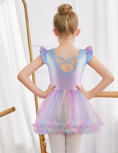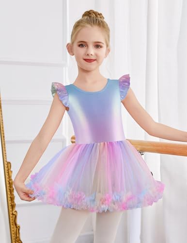 Zaclotre Tutu Dance Dresses for Girls Ruffle Sleeve Criss-Cross Back Ballet Leotards Toddler Ballerina Costume Rainbow