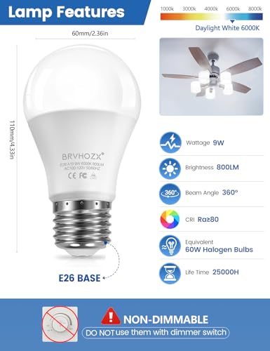 - [90% Energy Saving & Cost-Cut] Switch to our energy efficient 9W E26 LED bulb to replace any traditional 60 watt halogen or incandescent bulb (60W Equivalent). These cost-effective led bulbs deliver 800LM of crisp light, slash electricity bills by 90% and offer 25,000 hours long life, making it a budget-friendly choice for sustainable home lighting, [Crystal Clear Daylight White 6000K] Enjoy crystal clear, cool glow with daylight white 6000k sharp clarity. Perfect for detailed tasks in workshops, storage rooms and high-definition areas requiring intense daylight white light, [Flicker-Free Eye Care & Healthy] Protect your vision with this premium flicker-free LED lamp. Featuring a high 80+ CRI, these led lights restore vivid colors while eliminating eye strain or fatigue caused by strobe. This ensures stable, natural illumination, providing a safe healthy lighting solution for your kids and family, [Seamless Fit & Easy Installation] Designed with a standard A19 shape and E26 medium screw base, these non-dimmable bulbs fit most home fixtures perfectly. Simple twist-in setup for g60 or a60 sockets. Note: these are standard AC 120V lamps, not for use with dimmers, smart switches or rechargeable units, [Workshop & Industrial Application] Perfect for workshop lamps, pendant lights and ceiling fans. Whether for a garage workshop, attic, storage room or basement, the 360° beam provides intense, uniform coverage for all professional daylight white lighting needs