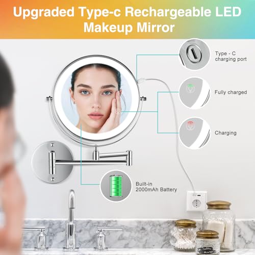 - 【Double Side with 30X/1X Magnification】30X wall mounted magnifying mirror with 8.5-inch diameter provides crystal-clear reflection for detailed grooming and makeup application. 1X mirror for regular makeup, 30X magnifying mirror for detailed makeup, like wearing contact lenses, trimming eyebrows, shaving, hair styling, facial treatments or applying mascara., 【3 Color Lights & Adjustable Brightness】The light up mirror has 3 different lighting settings, including white light, natural light and warm light to help you get the ideal light for your makeup. The stepless dimming feature allows you to adjust the brightness to your desired level, while the smart touch control makes it easy to switch between different lighting modes. The memory function will remember the last brightness setting., 【Wall Mounting& Extendable Arm Makeup Mirror】Professional-grade chrome-finished mounting bracket extends and swivels for flexible positioning and easy adjustment. The flexible mirror arm can be freely extended so that the magnifying mirror can be adjusted to the right viewing angle and distance, allowing you to freely apply makeup, shaving or wearing contact lenses, etc. It can be folded against the wall to save space when not in use., 【Cordless and Rechargeable Mirror】This upgraded wall mounted makeup mirror built-in 2000mAh rechargeable Lithium battery, which can be used 30 minutes a day for 12 days on a single full charge, and the extra-long battery life allows you to not have to charge it frequently. Type-C cable is included. No placing batteries needed, no unsightly cords on your walls!, 【Great gifts for Mother and Wife】Whether it's for Mother's Day gifts, Valentine's Day gifts, birthdays gifts, or Christmas gifts, our wall mounted lighted makeup mirror makes an excellent gift for the special women in your life, including girlfriends and family members. This wall mounted mirror can be used in a variety of environments such as bedrooms, bathrooms, hotels, spas and beauty.