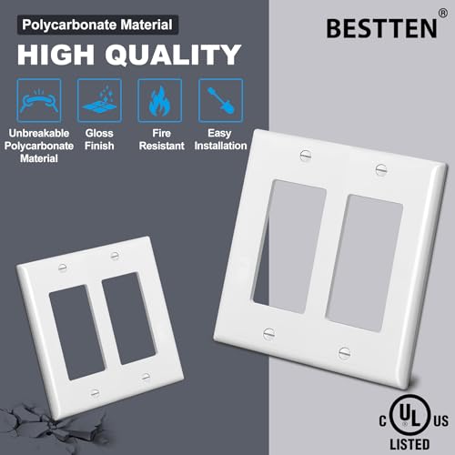 BESTTEN 2-Gang Decorator Wall Plate, 4 Pack Double Decor Faceplate, cUL Listed Receptacle Outlet Cover, Unbreakable Polycarbonate Light Switch Cover, Standard Size, White