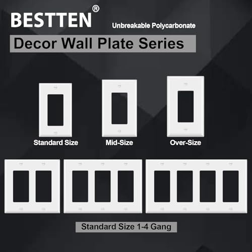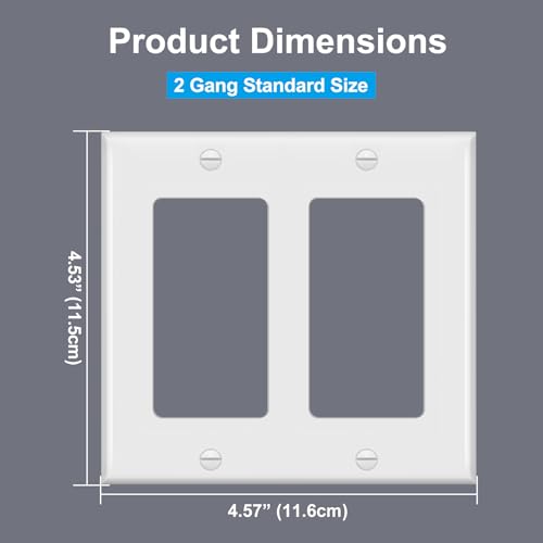 - 2-gang standard size wallplate: H4.53”(11.50cm) x W4.57”(11.60cm) x D0.25”(0.64cm), gloss white color, Smooth finish with round curved edges, easy to clean, Unbreakable polycarbonate thermoplastic, provides durability, flexibility, and resilience. Designed to withstand heat, impact, and fading, Matching screws included, cUL listed, Perfect with decorator/USB/GFCI receptacle outlets, rocker light switches, dimmer switches and sensor switches. 1-4 gang wall plates available
