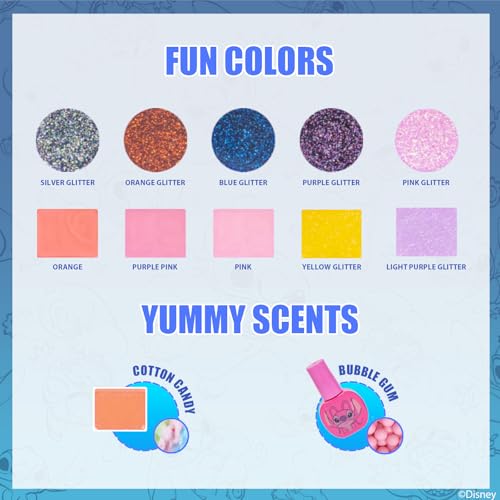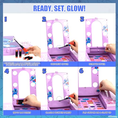 - SET INCLUDES: This set includes 8 wells of cotton candy flavored lip gloss, 8 wells of shimmery and glittery eyeshadows, 2 shimmery blushes, 3 wells of dazzling body glitters, 3 application brushes, 4 peelable, bubble gum scented nail polishes, 1 nail file, 1 nail sticker sheet, 1 nail gemstone sheet, and 1 body tattoo sheet, all nestled in a portable compact that features the many fun moods of Stitch, himself, and his gal pal, Angel, topped with a vanity lighted mirror, MADE FOR CHILDREN AGES 13 AND UP: Our cosmetic vanity set is carefully designed for girls ages 13 and older. Our non-toxic formulas make our lip glosses, eyeshadows, and blushes gentle and safe to use on children's delicate skin. Nail polishes are water-based and peelable, allowing limitless manicures, no harm done to nail beds, and since nail polish remover isn't needed, no harsh chemicals will touch little one's skin or nails. Our cosmetics wash out easily for those accidental spills, so parents do not need to worry about unexpected, hard to clean, messes., EASY AND FUN TO USE AND APPLY: The included accessories such as the applicator brushes, nail stickers, and nail gems are created so small hands can easily handle, apply and remove, allowing effortless glam and dazzle. This vanity set is also created in a kid-friendly manner, so turning the lighted mirror on and off requires just a simple flick of the switch, so young ones can see their beauty in the bright lights., BATTERIES NOT INCLUDED: Batteries are required for the light-up vanity mirror, but are not included. 4 AA (1.5V) batteries are needed, along with a small screwdriver to remove the battery cover. Battery input and removal should be done with or by an adult., GREAT FOR GIFTS AND PARTIES: Children will have a great time trying out all the amazing flavors and shades, and can enjoy endless dress-up play! Girls will be thrilled to put on the sparkly lip glosses, nail polishes, cosmetics and accessories, all day, every day. It's the perfect addition to sleepovers, makeovers, and spa days, as well as serving as the ultimate gift for birthdays, holidays, or just because!