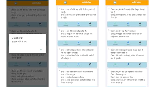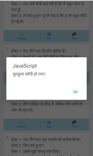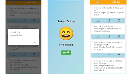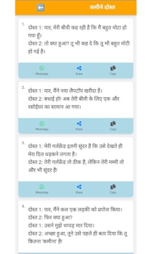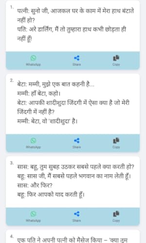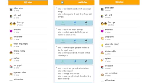 - 😄 Huge collection of hilarious Hindi jokes, 📂 Jokes organized into fun categories like Family, Friends, and Pati-Patni, 🆕 Regular updates with fresh new jokes, 🔤 Easy-to-read Hindi font with clear layout, 📤 One-tap share option for WhatsApp, Facebook, and more