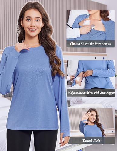 Deyeek Port Shirts for Women Chemo Patients Chemotherapy Must Haves Tear Away Long Sleeve Dialysis Shirts with Arm Zipper Blue XL