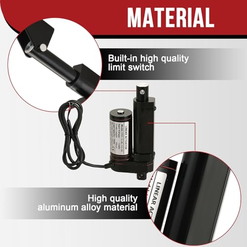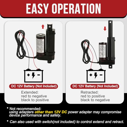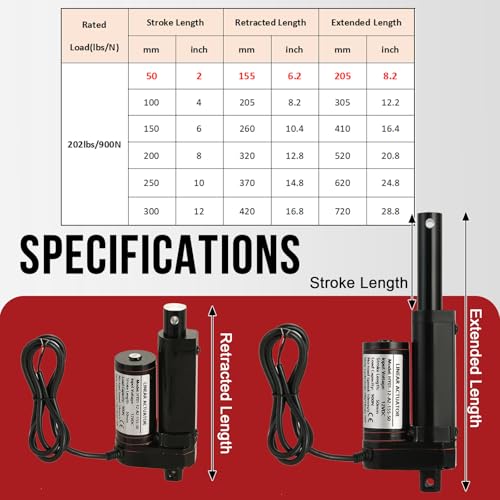 - Durable & High-Performance: Constructed with a sturdy aluminum alloy housing and equipped with a high-performance motor, this 12V linear actuator is built to last. IP54 waterproof and dustproof rating makes it perfect for outdoor applications like solar tracking and RV automation., Linear Actuator Specification: Travel speed = 0.39 inches/sec (10 mm/s); Input Voltage: 12V DC. Rated power: 20W, maximum 30W; Stroke length = 50mm(2"); Retracted length = 155mm(6.2"); Extended Length=205mm(8.2“); Maximum current consumption: 3A; Maximum Load = 202lbs(900N), Safe & Smooth Operation: Features built-in limit switches for automatic stop at full extension or retraction, protecting the motor and extending lifespan. Operates quietly under 50 dB, with self-locking and multi-layer protection against overcurrent, overload, and short circuit., Easy Mounting with Included Brackets: Comes with durable mounting brackets designed for simple installation of your 12V electric linear actuator on boats, RVs, and home automation setups., Wide Application: This linear actuator is ideal for use in solar tracking systems, RV slide-outs, TV lifts, recliner lifts, and automatic door openers. Perfect for automation, lifting, pushing, and pulling tasks.