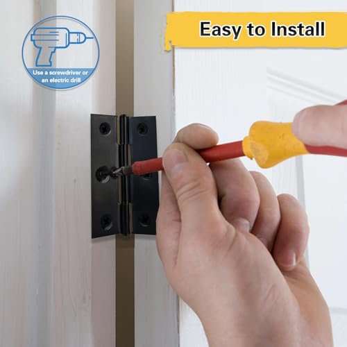 - Compact & Versatile: These 3-inch black door hinges are perfectly sized for small-scale applications such as jewelry boxes, wooden crafts, and miniature furniture, Durable Stainless Steel: Door hinge constructed from premium stainless steel, ensuring excellent resistance to rust and corrosion for long-lasting performance, Sleek Black Finish: Black hinges Featuring a modern matte black coating that adds a sophisticated and stylish touch to any project or piece of furniture, Complete Installation Kit: Each pack includes 10 hinges and 60 matching screws, providing everything needed for immediate and secure mounting, Reliable Functionality: Designed for smooth and quiet operation, these small hinges offer dependable support and movement for light-duty doors and lids