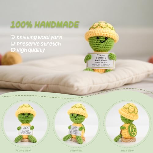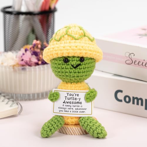 - FUNNY TURTLE CROCHET: Each turtle is carefully crocheted by skilled craftsmen with high-quality wool yarn. Paired with an inspirational card printed with "Sometimes you forget that YOU'RE TURTLE-Y TURTLE", SIZE INFORMATION: The funny turtle crochet doll measures 4*2.5 inches and comes with an inspiring text card, suitable for placement on desks, car dashboards, bookshelves, etc., ENCOURAGING PARTNER: The knitted turtle can be easily put into a handbag or wallet. Whether it is dealing with busy workdays, commuting, or encountering moments of self-doubt, this tangible encouragement can accompany you silently and bring you comfort, GIFT CHOICE: Whether it is given to a bestie, sister, teacher or colleague, this happy turtle can deliver hugs and bring happiness. Cute appearance + inspirational text card can make the recipient smile, EMOTIONAL SUPPORT GIFT: The inspirational turtle is suitable for birthdays, Christmas, or gifts on a whim, to convey to important people that I see your efforts and you are special, so that she can stay positive and confident