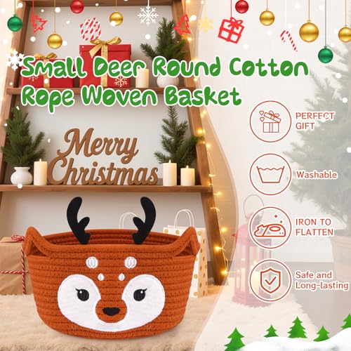 - Soft Woven Deer Basket: This small basket is made of soft woven cotton rope with embroidered deer face and felt antlers. This skin-friendly basket stays clean easily, making perfect baskets for gifts. Natural material ensures lasting storage., Small Storage Basket: 8.2 inches x 4.7 inches, this small rope basket fits shelves and desktops perfectly. Ideal woven storage for candy, keys, cosmetics and small items. Can store small other baby items., Christmas Ears Handles Basket: This Christmas woven storage basket has two animal ears handles with cute antlers. Perfect for atmosphere of Christmas. Easy to carry. Good small Christmas gift storage and baby diapers, toilet paper or towel., Baby Shower Basket: Nursery storage basket for holiday organizing or boo basket treats. Laundry home decor with baby gifts or baby blanket storage in nursery. Small basket can store baby essentials. Great as a bear basket or cat toy basket., Convenient Storage and Folding: The baby basket is foldable, if there is a crease, you can smooth it out with your hand or fill it with blanket, towels or stalls to prop it up and it will return to its shape.
