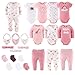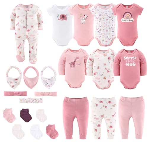 - Soft Comfort: Each piece is made from ultra-soft, 100% cotton newborn baby girl clothes that are gentle on delicate skin. Designed for comfort, these baby girl clothes keep your little one cozy in fall, winter, spring, and summer, Complete Essentials: Mix & Match these 23 versatile pieces. Set includes 4 short-sleeve and 3 long-sleeve bodysuits, a pink and white long-sleeve sleeper, 3 pairs of baby pants, 3 headband bows, 3 bandana bibs, and 6 pairs of socks, Cute Style: Dress your baby in style with Rainbow Safari theme baby clothing in pink and mauve safari animals, and pastel rainbow prints items. Great for showcasing your baby’s cute vibe right from the start, Joyful Baby Gift Registry: This generously sized newborn baby clothes set will pack your basket with all the essentials a newborn needs for the ultimate baby shower present for baby girl clothes that combine style, comfort, and practicality, Easy Care: Made with 100% cotton, these pieces are machine washable for quick and convenient cleaning. They’re durable and maintain their softness wash after wash, making them ideal for busy parents