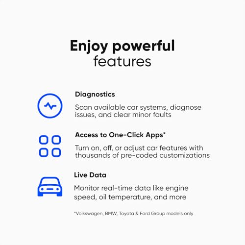 - OBDeleven 3 is a Bluetooth car diagnostic and customization tool officially licensed by Volkswagen Group (VAG), BMW Group, Toyota Group, and US-made Ford Group. No subscription required for diagnostics: The OBDeleven device includes the FREE plan by default. With the device and mobile app you can scan your vehicle systems, read and clear fault codes, monitor live data (engine speed, coolant temperature, oil temperature and more)., Advanced diagnostics: For officially supported brands (Volkswagen Group, BMW Group, Toyota Group and Ford US models), OBDeleven can access multiple control units and perform full system diagnostics. For most other modern vehicles (2008+), OBDeleven provides standard OBD2 diagnostics for the engine and transmission systems., Easy no-code customizations WITH IN-APP PURCHASE: Turn on, off, or adjust comfort, safety, and driving features using OBDeleven’s signature One-Click Apps – choose the ones you like and pay per activation with our in-app Credits. Integrate retrofitted parts, reset service lights, activate video in motion, Urban Joke, and much more. Thousands of options available for Volkswagen, BMW, MINI, Skoda. SEAT, CUPRA, Lamborghini, Bentley, Toyota, Lexus, and Ford (US) vehicles., Intuitive use: Simply plug the dongle into your vehicle’s OBD port, connect to the OBDeleven mobile app via Bluetooth, and start scanning right away. Use one OBDeleven account on multiple vehicles – there is no vehicle limit and no additional cost per car. | Supports Android and iOS and multiple languages: Fully compatible with Android 8.0+ and iOS 16.6+ mobile devices. The OBDeleven app is available in German, Polish, Italian, Lithuanian, Spanish, and Japanese., Basic diagnostics are free. Advanced features such as manual coding, advanced adaptations or UNLIMITED One-Click Apps require PRO or ULTIMATE plans., OBDeleven supports most modern vehicles. Compatibility depends on the vehicle brand, model year, and diagnostic protocol. Protocols supported: CAN-bus, KWP2000, and K-line protocols. Most vehicles manufactured before ~2008 are not supported. Volkswagen Group (VAG) vehicles are supported from ~1991 onward. Officially licensed vehicles (Volkswagen Group, BMW Group, Toyota Group, and US-made Ford Group) have full functionality: ✔Diagnostics ✔Advanced live data ✔Coding ✔One-Click Apps. OBD2 vehicles support basic diagnostics only: ✔Engine faults ✔Transmission faults ✔ OBD2 live data., Supported vehicles (advanced diagnostics & One-Click Apps):✔Audi (~1991+), Volkswagen (~1991+), Škoda (~1991+), SEAT (~1991+), CUPRA (~1991+), Bentley (~2011+), Lamborghini (~2011+)✔BMW (F, G, I Series & most E Series ~2008+), MINI (F & most R Series ~2008+), select Rolls-Royce models✔Toyota models ~2008+, Lexus models from ~2008+✔Ford vehicles ~2008+, US-made only. Other supported CAN-bus cars (engine & transmission OBD2 diagnostics only): Mazda, Hyundai, Nissan, Mercedes-Benz, Kia, Renault, Honda, Peugeot, Subaru, Volvo, Fiat, Mitsubishi, Opel, Citroen, Jeep, Suzuki, Land Rover, Jaguar., How OBDeleven works: 1. Plug OBDeleven into your vehicle's OBD2 port 2. Open the OBDeleven mobile app 3. Connect via Bluetooth 4. Scan & customize your car. OBDeleven requires the OBDeleven mobile app and a compatible Android or iOS smartphone. An internet connection is required. Available features may vary depending on vehicle model, model year & installed equipment. Common OBDeleven use cases: ✔Reset service lights ✔Register a new battery ✔Enable comfort features ✔Diagnose warning lights ✔Monitor engine data ✔Activate hidden vehicle features ✔Perform DPF regeneration ✔ Calibrate a steering angle sensor (SAS) ✔Replace rear brakes (put your car in service mode) ✔Unlock SFD., What Are One-Click Apps? One-Click Apps are pre-coded car customization functions. Each One-Click App costs Credits (starting from €1.99). This includes features like✔Inspection service reset✔Comfort feature unlocks✔Feature retrofits✔Battery registration (vehicle dependent) ✔Needle sweep✔Scandinavian DRLs✔Video in motion✔Urban Joke✔DPF-related functions (where supported). Available One-Click Apps vary by brand, model & equipment. Stable internet required. What are Credits? Credits are an in-app currency used to activate One-Click Apps – no paid plan needed. Bought separately, paid per activation, tied to your account, non-expiring while your account is active, and generally non-refundable., Important notes before purchase: ✔ Diagnostics are included with the device ✔ Manual coding and adaptations require PRO or ULTIMATE plans ✔One-Click Apps require Credits (unless using ULTIMATE plan) ✔ Vehicle compatibility depends on brand and model year ✔ Credits are non-refundable once used ✔ Ford support applies to US-market vehicles only