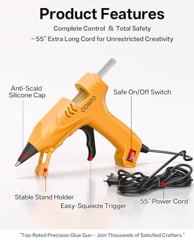 - INCLUDES 30 PREMIUM CLEAR GLUE STICKS & FAST 3-MIN HEAT-UP: Get started right away with a full pack of 30 high-quality, clear PVC glue sticks (100*7mm). Enjoy longer-lasting bonds compared to standard sticks. Heats up ready for action in just 3 minutes and maintains a constant temperature for reliable performance, PRECISION ANTI-DRIP NOZZLE & HEAT-SAFE DESIGN: Achieve clean, controlled application with the anti-drip nozzle – no messy drips or globs, perfect for detailed crafts. The heat-resistant rubber coating on the thermal cap prevents accidental burns during use, EASY-TO-USE TRIGGER & SAFETY FUSE PROTECTION: Simply press the ergonomic trigger for smooth glue flow. A built-in safety fuse provides essential overheating protection for peace of mind during extended crafting sessions, CONVENIENT FOLDABLE STAND & CHILD-SAFE SWITCH: Features a practical fold-up holder to keep the glue gun stable and upright on your workbench. The dedicated on/off power switch adds an extra layer of safety, making it more suitable for households (with supervision), VERSATILE 20W TOOL FOR DIY, CRAFTS & QUICK FIXES: Tackle a wide range of projects! Perfect for hobbyists, DIYers, crafters, students, and quick home repairs – ideal for scrapbooking, model making, decorations, gift wrapping, fabric projects, and minor household fixes