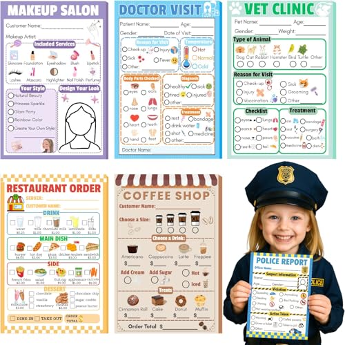 - 6 Fun Pretend Play Themes: This set includes six popular role play notepads — Police, Doctor, Restaurant, Makeup Artist, Coffee Shop, and Veterinarian — designed to inspire creative, inclusive play for both boys and girls., Encourages Learning Through Play: With colorful icons and simple layouts, each pad guides children step-by-step through real-life scenarios, boosting creativity, early math, reading readiness, focus, and social skills., Kid-Friendly Design: Bright illustrations and easy-to-understand layouts help young children confidently complete role play tasks independently., Screen-Free Creative Fun: A perfect alternative to tablets and video games, these pads engage kids’ imaginations and encourage active, screen-free play., Portable & Convenient: Each 4 x 6 inch notepad contains 40 pages of imaginative fun, sized perfectly for little hands and easy to carry — ideal for home, school, or travel.