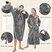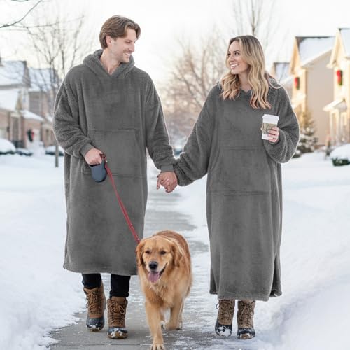 - Simple & Snuggly Warmth: Still dreading winter's chill? Our pullover hoodie is crafted from super soft, fluffy material that feels like wrapping yourself in a thick, fuzzy blanket—keeping you cozy and warm. The easy-to-wear design lets you slip into this oversized snuggie instantly at home, skipping the hassle of layering. Perfect for adults seeking effortless comfort all season long., Thoughtful Design: It’s a wearable blanket with sleeves—built to last with reinforced seams. The elastic sleeves can be pushed up and stay in place without feeling too tight around your arms—perfect for staying comfortable during any activity. The snuggies for women and men keeps your neck and head heated, while the big hexagonal pocket warms your hands and holds your phone, snacks, or keys. The long, ankle-length cut covers you head-to-toe like a onesie, but with full freedom to move., Versatile for Multiple Occasion: Available in oversized sizes, the big plush hood fits both regular and tall & large frames. This all-in-one comfy sweatshirt is your go-to for any moment,such as lounging at home, attending casual parties sipping morning coffee, post-shower relaxation, or quick errands. The roomy pocket holds must-haves, while the hood shields you from the cold—making it perfect for walking the dog, taking out the trash, or popping to the store., Great As a Gift: Choose from classic colors like black, red, dark gray and light gray or purple (even a soft pink!) for a plush, soft layer that’s as stylish as it is functional. This blanket sweatshirt is unisex, making it a perfect gift for friends and family on Christmas, New Year, Valentine's Day, anniversaries, or any ordinary day. Let this wearable blanket hoodie, filled with love, become a warm and unique addition to his or her wardrobe., Easy Care: Machine washable and durable, this wearable blanket with sleeves of ribbed cuff resists deformation and stays soft even after long-term use, keeping you warm through multiple autumn and winter seasons. Due to compressed packaging, it is recommended to wash before first use to restore its softness and fluffiness.