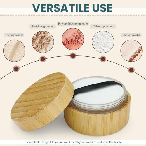 - Premium Bamboo Construction: Crafted from high-quality bamboo, these elegant loose powder containers are sturdy, stylish, and exudes a luxurious texture. The included puff is made of soft fabric and sponge, effectively absorbing and evenly distributing powder for a flawless application, Detachable Sifter Design: The powder puff and container features a detachable sifter that ensures even consistency, prevents excess dust, and dispenses just the right amount of powder. An metal opener tool is included for easy sifter removal when refilling, Secure Screw-On Lid: The airtight screw lid of dusting powder container with puff allows effortless opening and closing while keeping the powder securely contained - no leaks or spills, even when traveling, Compact & Travel-Friendly: Measuring 7.4cm/2.9in in diameter and 4.3cm/1.7in in height, this lightweight travel powder container holds up to 30ml/1oz of powder (with a 2mm/0.08in sifter hole). Tip: Avoid overfilling to ensure the sifter fits properly, Versatile Use: The cosmetic jar is perfect for loose powder, setting powder, blush, shimmer powder, powdered sunscreen, deodorant, talcum powder, foundation, and more. Ideal for daily touch-ups, travel, outdoor activities, or business trips