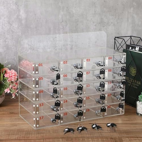 - [High-Quality Acrylic]: This Cell Phone Locker Box is crafted from Durable Acrylic, ensuring Longevity and Environmental Friendliness. The Thickened Design enhances Stability and Resilience, making it a Reliable Choice for Securely Storing Your Devices. Perfect for Offices, Schools, and Public Spaces, it Offers a Safe and Organized Solution for Cell Phone Storage., High Safety: Each Cell Phone Locker measures 3.9*7*3.9 inches, providing easy access while protecting your hands. Designed to accommodate multiple stacked Cell Phones, each locker features two unique keys for enhanced security. With distinct locks, your privacy is safeguarded, preventing unauthorized access and theft. Ideal for schools, offices, and events., 【Strong Load-bearing Capacity】: The rectangular shape forms a stable structure, so it can stand more firmly. You can use it without worrying about it shaking and tipping.The cell phone locker box which is strong enough for you to store items without worrying about it shaking and tipping., 【Easy to Install】: This cell phone locker box can be freestanding or wall mounted. It comes with complete accessories which can help to install on the wall easily, saving you floor space as well as time and effort., 【Reliable Protection】 : Our products have been tested, Inspected and packaged before they are sent out, So you can buy them with confidence.If you have any questions about our product, please feel free to contact us, we will provide you with satisfactory solutions.