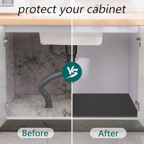 - 【Protect Your Cabinets】:Under the sink mat waterproof protect your cabinet and floor, prevents damage from leaks, spills, stains and scratches. Under sink protector mats can save your money on cabinet repair in kitchen, bathroom or anywhere else in home., 【Compatible Sizes】:The TRZZ under sink mat measures 28" x 22" with a 0.6-inch depth to effectively handle water from cabinet leaks; not suitable for cabinets smaller than 28" x 22", 【Silicone Material】: Under sink waterproof mat was made of thick flexible silicone, durable and waterproof. And each silicone under sink mat has a hexagonal textured pattern that adds a sense of design while giving it a good grip and preventing items from sliding., 【Easy to Clean】:The under kitchen sink mats and protectors with unique rhombic stripe design can help to lock water and prevent water from flowing everywhere. Just wipe the under sink waterproof mat with a wet cloth or rinse with water for a fresh look., 【Multipurpose】:This under sink silicone mat is suitable for bathroom sink cabinet, kitchen sink cabinet. It also can be used as pet feeding mat, craft mat, mini fridge mat or other place need to avoid mess or spill, keep your house clean in every corner.