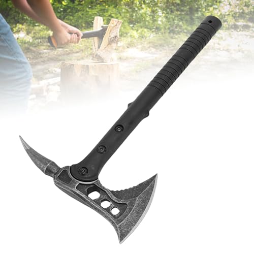- Reinforced Structure: This portable axe features multiple hex screws for secure fixation, ensuring long lasting stability during heavy duty chopping, splitting, or other outdoor tasks, Versatile Use: Designed for efficient branch cutting and trail clearing, the axe delivers powerful strikes with minimal effort, while its reinforced handle doubles as a glass breaker and wrench, Ergonomic Design: The non slip handle is crafted for more comfort, reducing hand fatigue during extended use. Using with various gloves (not included) to enhance security in rugged conditions, Protective Sheath: Includes a lightweight yet tough nylon sheath to protect the axe edges during transport or storage, making it practical for backpacking or emergency tasks, Portable and Practical: With its portable size, this multifunctional hatchet easily fits in backpacks or car trunks, serving as a practical tool for hiking, camping, or outdoor adventures