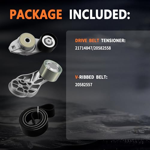 - Replace Part Number: Belt Tensioner 21714847 20582558 & Belt 20582557., Fitment: Belt Tensioner Component Kit fits for Volvo D13 Fan., Package Includes: 1* Serpentine Belt, 2 * Tensioner Assembly., Function:Replace the Old or Broken Belt Tensioner to Eliminate Noise, Achieve Consistent Tension, Alignment. Make the Transmission System Runing Stable, Efficient, and Extend Service Life., Warm Notice: Before Ordering, Please Double-check the Part Number and Model with Your Original One to Make Sure It Fits Your Vehicle.