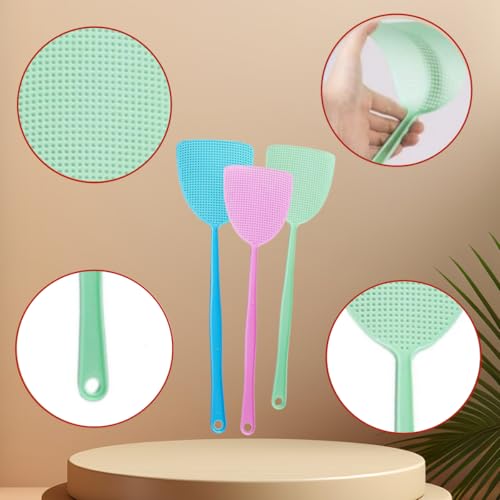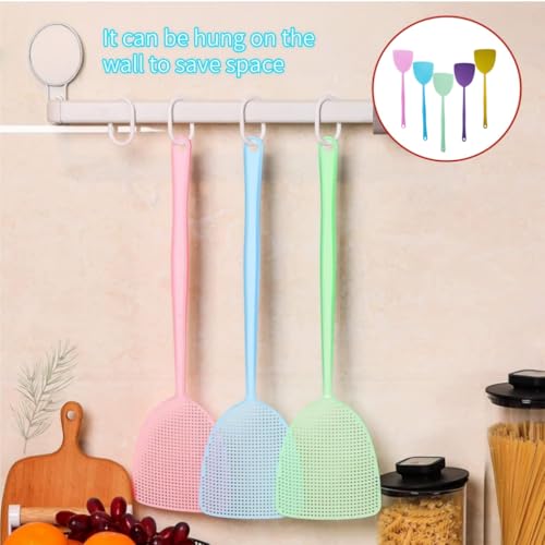 - 【Premium Material】:Fly swatters were made of soft plastic material, grid hole striking area and handle integrated design, lightweight and portable, not easy to break,The plastic material prevents you from scratching and damaging furniture when flying, 【Unique Design】:Enough long enough to swat flies even though in a long distance,The handle has a hanging hole that can be hung on the wall to save space,save space and convenient, 【Package Contentsn】: You will receive 5 pcs flexibleand long handle swatter set,there are three colors, pink, blue, green, purple and yellow,the dimensions are as shown in the figure,convenient to use everywhere, 【Easy to Use】: when you see a fly, you can slap quickly and flexibly,which is wide mesh hitting area and more practical, fine mesh effectively reduce wind resistanceand increase slapping speed, easy to hit fast-moving targets, 【Wide Application】: Quickly those pesky flies, mosquitoes, fruit flies, wasps and other insects, hangable design, especially suitable for use in the kitchen,camping and other outoor activities