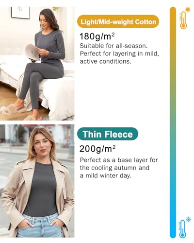 - Soft & Breathable Cotton Blend:Made with a comfortable 95% cotton/5% spandex blend, The fabric feels soft against skin and promotes airflow for breathability, Comfy Fit & Flexible Waistband:Full-length sleeves and pants provide gentle warmth. Classic crew neck design offers timeless, effortless style. The elastic waistband flexes with your body, avoiding tightness or restriction, Versatile for Three Seasons:A practical lightweight layer for cooler weather in spring, fall, and winter. Wear as women’s pajama sets or a cotton base layer under sweaters, hoodies, and jackets, Perfect for Layering or Lounging:Ideal as cozy pyjama femme at home. Also functions well as everyday thermal underwear for added warmth under clothes or relaxing solo, Easy Care & Durable:Machine washable for simple maintenance. The fabric resists pilling and holds up well over time. For the best fit, consult our size chart before purchase to ensure optimal comfort