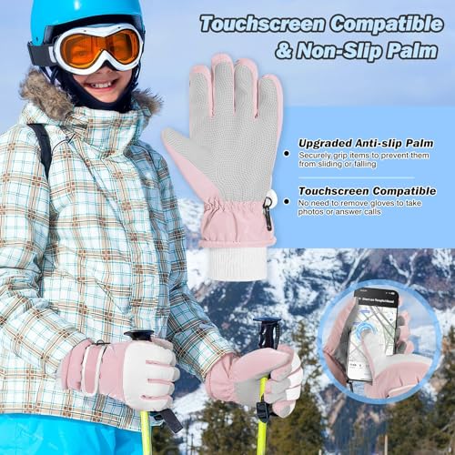MoKo Kids Winter Ski Gloves, Waterproof & Windproof Thermal Snow Gloves with Elastic Cuffs for Children 6-15,Skiing, Snowboarding, Sledding, Pink&White, M