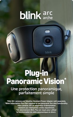 - Blink Arc is a compact, weather-resistant mounting solution for Blink Mini 2K+ or Mini 2 cameras, delivering 180° panoramic vision with a Blink Subscription Plus Plan (cameras and subscription sold separately)., Comprehensive coverage of your space — Connect two compatible Blink cameras into one integrated system with 180° horizontal coverage. Works with two identical Blink Mini 2K+ or two Blink Mini 2 cameras and a Blink Subscription Plus Plan (cameras and subscription sold separately)., See more, without the mess — Enjoy a clutter-free setup and power both cameras through one cable with the built-in weather-resistant splitter, eliminating the need for multiple cords., Transform your security with Panoramic Vision — Get a quick 180º snapshot of what's happening around your home, available with a Blink Subscription Plus Plan (sold separately)., Versatile placement inside or out — Blink Arc is perfect for monitoring backyards, driveways, entryways, foyers, and other large spaces. Blink Weather-Resistant Power Adapter is required for outdoor use (sold separately)., Includes one Blink Arc and two screws.