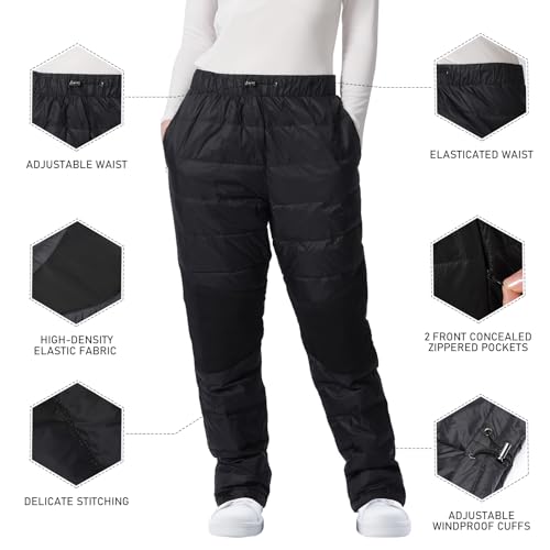 - PREMIUM WARMTH & WATERPROOF FABRIC: Crafted with high-quality waterproof nylon, these winter puffer pants feature a soft, breathable lining and premium cotton insulation for exceptional warmth. Stay cozy and dry in any weather with their windproof and waterproof design., THOUGHTFUL DESIGN for ALL-DAY COMFORT: Enjoy a customized fit with the adjustable waistband and elastic cuffs. The hiking pants include two spacious zippered side pockets, perfect for securely storing essentials during outdoor activities or daily wear., ERGONOMIC FREEDOM of MOVEMENT: Designed for active lifestyles, the knee areas are reinforced with stretchable knit panels, allowing unrestricted motion whether you're skiing, hiking, or commuting., VERSATILE for ADVENTURE & EVERYDAY WEAR: Ideal for winter sports like skiing, ice fishing, and mountaineering, these skiing pants also blend style and functionality for urban outings or casual wear. Their sleek design ensures you stay warm and stylish wherever you go., EASY CARE & RELIABLE SUPPORT: Low-maintenance and built to last, these pants come with a 1-year warranty and 24/7 customer service. For the perfect fit, refer to our detailed size chart (XS-3XL) before ordering.