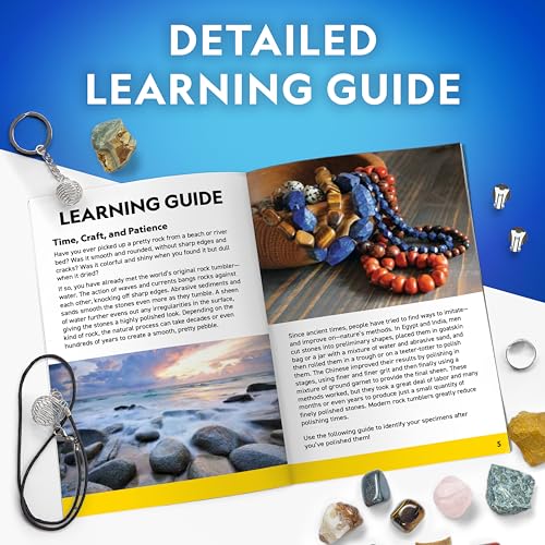 - ENORMOUS VARIETY - This rock tumbler refill kit has 2.26 kg of unpolished rocks and gemstones consisting of a 956 g gemstone mix, 453 g agate mix, 453 g Madagascar mix, and 453 g jasper mix., ROCK POLISHING GRIT – There are 20 total rock tumbler grit packets in the kit, enough for five complete tumbling cycles with any rock tumbler!, JEWELLERY SETTINGS – Once your rocks are polished, use the 5 included jewellery settings to create beautiful keepsakes or use the included storage pouch to keep your favourite specimens all in one place., DETAILED LEARNING GUIDE – The Learning Guide includes polishing instructions along with fascinating information about the stones in the kit., AWARD-WINNING PRODUCTS - Blue Marble, winner of the Toy Association's prestigious Toy of the Year Award, proudly develops products that foster education, imagination, and creativity, with a U.S. support team to ensure a stellar experience!