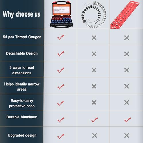 - 【44-Piece Nut and Bolt Thread Checker】All thread gauges are placed individually in a well-organized foam storage holder, ensuring you always have the correct nut and bolt gauges. It supports measurements in tight spaces and is ideal for a variety of applications., 【Excellent Recognition Ability】Available in standard and metric sizes, all thread gauges are machined with extreme precision. We use blue for SAE (inches) and red for metric to make it easier for you to identify. Additionally, both sides of each thread size gauge are laser etched, eliminating the hassle of having to rotate the thread gauge to check, 【23 Inch & 21 Metric】Inch in blue:1-12,1-8,3/4-16, 3/4-10, 5/8-18, 5/8-11, 9/16-18, 9/16-12, 1/2-20, 1/2-13, 7/16-20, 7/16-14, 3/8-24, 3/8-16, 5/16-24, 5/16-18, 1/4-28, 1/4-20, 10-32, 10-24, 8-32, 6-40, 6-32; Metric in red: M3-0.5, M4-0.7, M5-0.8, M6-1.0, M7-1.0, M8-1.0, M8-1.25, M10-1.0, M10-1.25, M10-1.5, M12-1.25, M12-1.5, M12-1.75, M14-1.5, M14-2.0,M16-1.5, M16-2.0, M20-1.5, M20-2.5, M24-2.0, M24-3.0; (bolt and nut thread identifier, thread gauge sae and metric), 【Easy to Use】The thread checker tool is easy to use. Simply insert the appropriate gauge into the threads and compare it to the chart provided on the side of the tool to determine the thread size. This thread gauge kit is ideal for engineers, machinists and DIY enthusiasts, 【Two Year- 100% Guarantee 】Buy with confidence, if you're not satisfied with this item at anytime within two years of purchase, please feel free to contact us at any time, we have a professional customer service team to our every customers at any time. Package: 44pcs Nut and Bolt Thread Checker